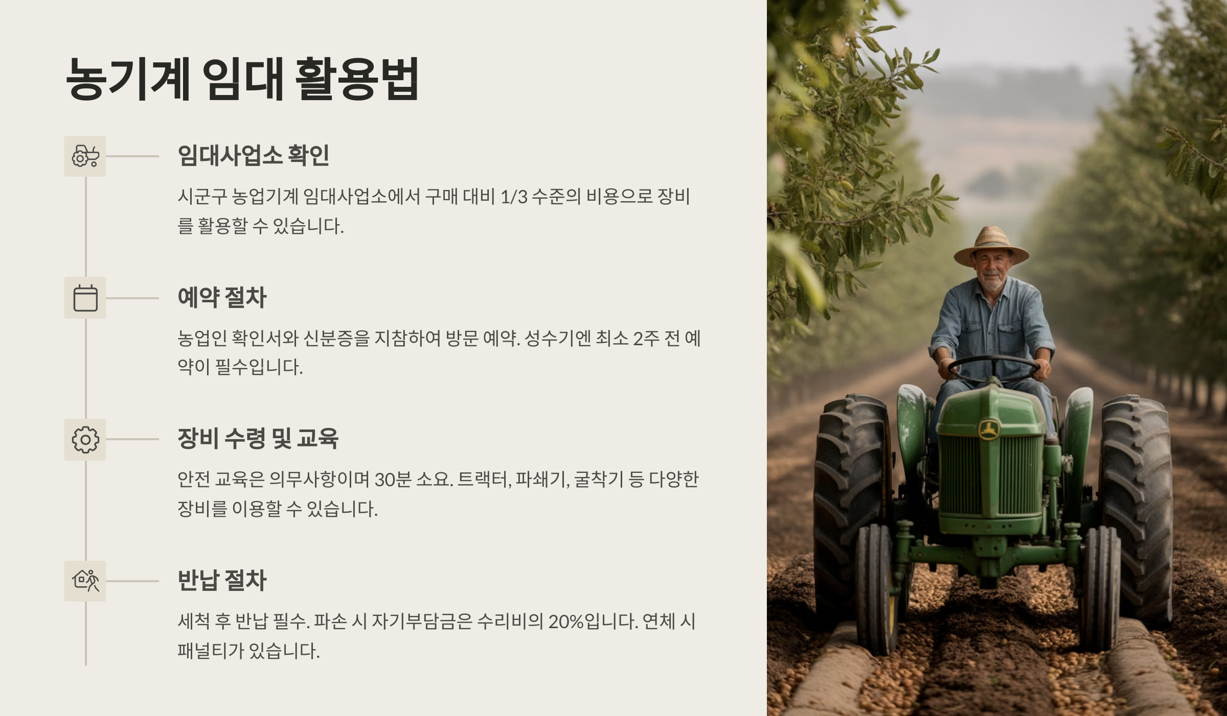 농기계는 한 번 구매하면 수천만 원에 달하는 고가의 자산이에요. 그런데 호두나무 재배 특성상 매일 사용하는 기계가 아니라 일 년에 몇 번만 필요한 경우도 많죠. 이런 상황이라면 직접 구매보다는 '임대'가 훨씬 현명한 선택이 될 수 있어요. 🙌