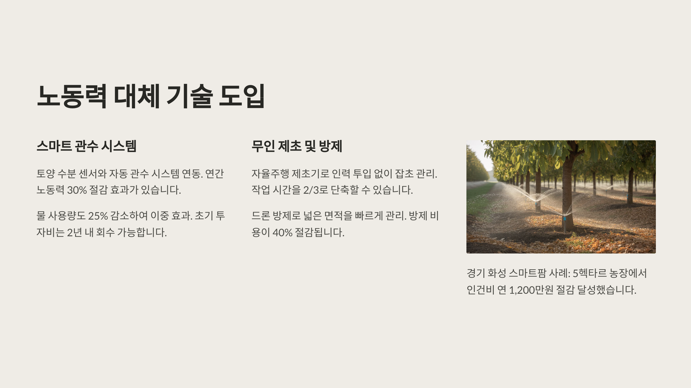 이제 다음은 💡노동력 대체 기술에 대한 이야기로 넘어갈게요. 사람 손이 부족한 시대, 어떤 기술이 호두농장을 도와줄 수 있을까요?