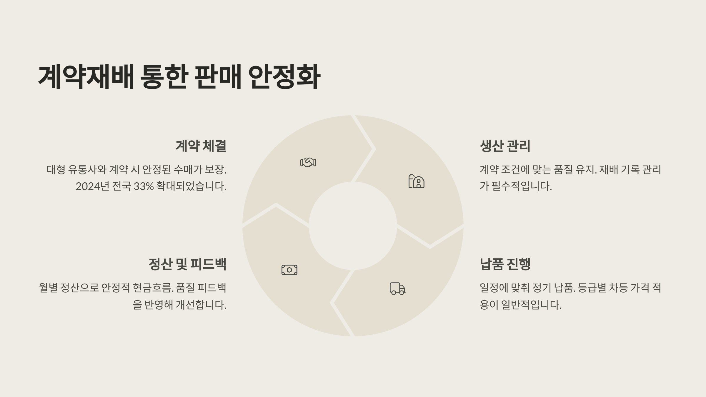 계약재배는 말 그대로 수확 전에 구매자와 미리 계약을 체결해 일정 수량을 정해진 가격에 납품하는 구조예요. 주로 대형 유통사, 가공업체, 급식업체 등과 연결되어 있는데요, 가장 큰 장점은 '가격과 물량이 고정되어 수익 예측이 가능하다'는 점이에요.